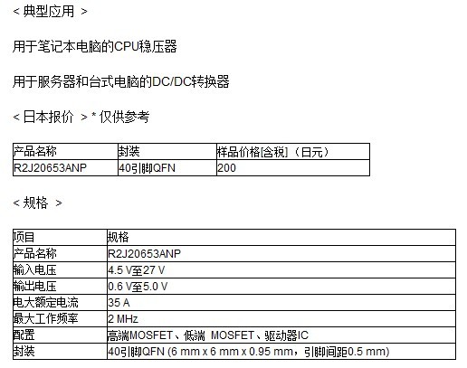 長(zhǎng)期以來(lái),瑞薩一直在提供符合DrMOS標(biāo)準(zhǔn)的一系列產(chǎn)品,尤其是輸出電壓為12V的服務(wù)器和臺(tái)式電腦。新的R2J20653ANP將可承載的輸入電壓擴(kuò)展到適用于筆記本電腦的20V適配器電壓,成為瑞薩高電壓容限電源類的首款產(chǎn)品。這款產(chǎn)品的推出有助于筆記本用CPU電源在實(shí)現(xiàn)更加小型化的同時(shí),達(dá)到更高的性能,并且有望帶動(dòng)DrMOS標(biāo)準(zhǔn)更加廣泛的應(yīng)用。