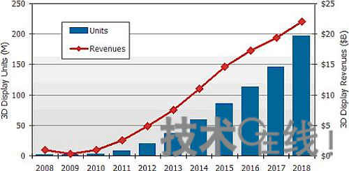 目前,3D(三維)顯示器非常引人注目。最新發(fā)布的《3D顯示器技術(shù)&市場調(diào)查報告》預(yù)測,3D顯示器市場的供貨量和供貨金額將從2008年的70萬臺、9億200萬美元增長至2018年的1億9600萬臺、220億美元(圖1)。如果市場果真按照該預(yù)測增長的話,年均復(fù)合增長率(CAGR)按金額計算將達到38%,按數(shù)量計算將達到75%。