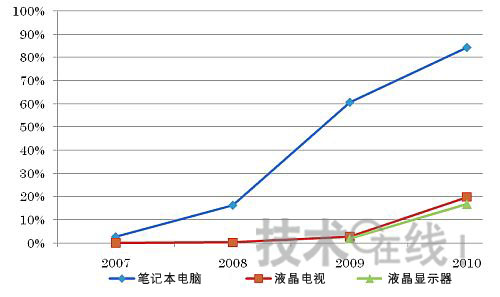 液晶顯示器配備LED背照燈的進展超過預(yù)期 筆記本電腦面板配備LED背照燈早于液晶電視面板,于2007年就全面開始了。2009年的LED背照燈配備比例達(dá)到了60%以上。預(yù)計2010年開始將全面向LED背照燈時代過渡。在2010年配備比例將達(dá)到80%以上,2012年之前將全面改用LED背照燈。