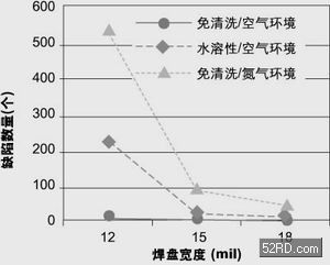 圖3是焊點不良與焊盤的寬度及組裝工藝的關系。這些數(shù)據(jù)是每種組裝工藝都選用最佳焊盤形式而得出的,試驗時將焊盤的長度和焊盤間距設為常量,只對焊盤寬度進行變化。通常來講,三種組裝工藝的良品率均隨焊盤寬度增大而提高,而不良率在焊盤寬度為0.012到0.015英寸之間較為敏感。水溶性焊膏在空氣環(huán)境中焊接和免清洗焊膏在充氮環(huán)境中焊接都是在焊盤寬度最大即0.018英寸時焊點缺陷最少,但這種情況在免清洗焊膏空氣環(huán)境下焊接時有一些改變,此時最高良品率是在焊盤寬度居中時(0.015英寸)得到的,然而由于使用這種工藝組裝的板子產(chǎn)生的不良數(shù)量非常少,所以焊盤寬度在0.015英寸和0.018英寸時不良數(shù)目之間的差異在統(tǒng)計上并不明顯。如果從組裝工藝的角度來看良品率變化趨勢,可以看到免清洗焊膏在空氣環(huán)境中焊接對焊盤寬度變化最不敏感,而免清洗焊膏在充氮環(huán)境下焊接工藝則對焊盤寬度變化最為敏感。