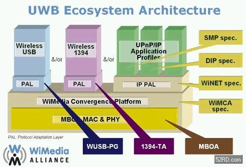 Wireless USB 1.0標(biāo)準(zhǔn)是在2005年5月12日正式發(fā)佈,它的實體層(PHY Layer)、媒控層(MAC Layer)是使用MBOA組織所訂立的超寬頻(UWB)技術(shù),在PHY層、MAC層之上再搭建一層WiMEDIA Alliance所訂立的聚合層(Convergence Layer,IEEE 802.15.3a),在聚合層之上再依據(jù)不同的無線傳輸應(yīng)用而訂立不同的協(xié)定因應(yīng)層(Protocol Adaptation Layer;PAL),最后才將WUSB的通信建立于最上端,如此使WUSB運作。(附註:MBOA(Multi-Band OFDM Alliance)于2005年3月與WiMEDIA Alliance合併。)