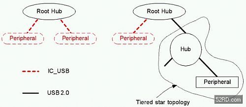 Inter-Chip USB并不支援透過Hub的連接(紅線),只有傳統(tǒng)USB可透過Hub進行連接(黑線)。
