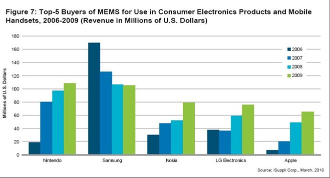 據(jù)iSuppli公司,日本任天堂在2009年超越韓國的三星,成為用于消費電子產(chǎn)品和手機的微機電系統(tǒng)(MEMS)的全球最大買家。