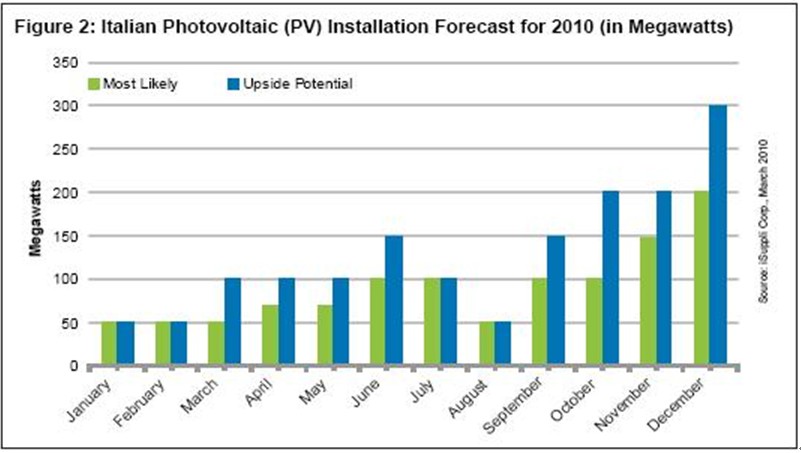 最可能出現(xiàn)的情況是,2010年意大利市場將安裝1.1GW,年終的四個月需求將會大增。但是,由于將下調(diào)FIT,意大利2010年安裝容量也很有可能高達1.5GW。