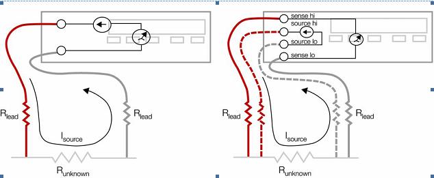 圖2(右)4線電阻測量消除了電壓引線中的電流,消滅了這一誤差來源。