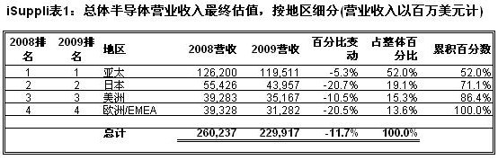 表1所示為iSuppli公司對2009年各地區(qū)半導體營業(yè)收入的最終估計。