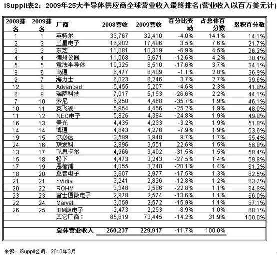 表2所示為iSuppli公司對2009年全球半導體廠商營業(yè)收入的最終排名。