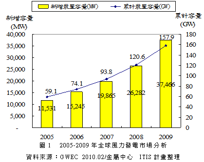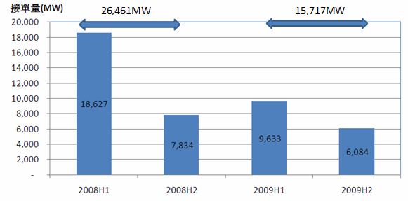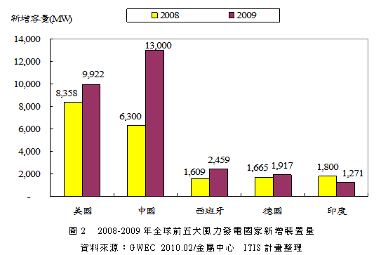 2009年全球風(fēng)力發(fā)電市場不畏金融海嘯沖擊,在美國及中國政府大力推廣下,新增風(fēng)力發(fā)電裝置量仍較2008年成長31%。但因2009年新增容量主要來自既有存貨,風(fēng)力機(jī)接訂單量僅為15,717MW,較2008年衰退41%。前瞻2010年,在中、美及歐洲風(fēng)電大國帶動(dòng)下,全球風(fēng)力發(fā)電新增容量將較2009年成長15%;而風(fēng)力機(jī)接單量受到價(jià)格驟降及主要風(fēng)電大國景氣回升影響,可望庫存回補(bǔ)而為2009年的2.2倍。