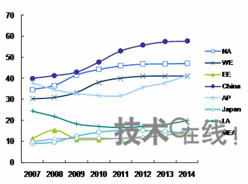 2010年中國(guó)的電視市場(chǎng)規(guī)模將達(dá)到4800萬(wàn)臺(tái),按供貨量計(jì)算,規(guī)模為全球最大。其他新興市場(chǎng)國(guó)家的需求2010年也將開始恢復(fù)。到2014年,亞太地區(qū)的電視供貨量將超過(guò)西歐,新興市場(chǎng)國(guó)家將推動(dòng)全球電視市場(chǎng)擴(kuò)大。