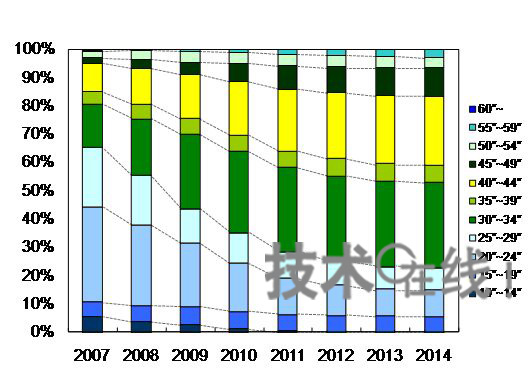 40英寸以上的電視在整體中所占的比例預(yù)計(jì)2010年會(huì)超過(guò)30%。2013年會(huì)達(dá)到40%,之后將基本飽和。分地區(qū)來(lái)看,中國(guó)正在追趕在電視大型化方面領(lǐng)先的北美和西歐,從這一點(diǎn)來(lái)看,中國(guó)的影響力會(huì)擴(kuò)大。