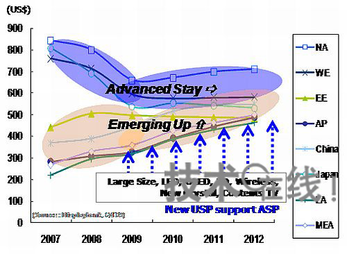 分地區(qū)看電視的平均銷售價(jià)格(ASP)變化可預(yù)測(cè),發(fā)達(dá)國(guó)家市場(chǎng)的ASP暴跌將告一段落,而在新興市場(chǎng)國(guó)家,隨著FPD電視的增加和屏幕大型化,ASP將會(huì)繼續(xù)上漲。另外,估計(jì)LED背照燈液晶電視、3D電視、IPTV及無(wú)線功能等的普及也會(huì)成為推高ASP的因素。