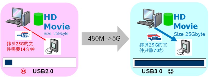 USB(Universal Serial Bus)即通用串行總線,用于把鍵盤、鼠標(biāo)、打印機(jī)、掃描儀、數(shù)碼相機(jī)、MP3、U盤等外圍設(shè)備連接到計算機(jī),它使計算機(jī)與周邊設(shè)備的接口標(biāo)準(zhǔn)化。在USB1.1版本中支持兩種速率:全速12Mbps和低速1.5Mbps;而USB2.0中支持三種速率:高速480Mbps、全速12Mbps、低速1.5Mbps。在2002年Intel把USB2.0端口整合到了計算機(jī)的南橋芯片ICH4上,推動了USB2.0的普及,目前除了鍵盤和鼠標(biāo)為低速設(shè)備外,絕大多數(shù)設(shè)備都是速率達(dá)480M的高速設(shè)備。