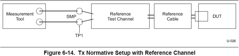 在USB3.0的TX的眼圖和抖動測試中,測量的是待測試信號經(jīng)過參考測試信道后TP1點(diǎn)的眼圖和抖動。如圖5中的Reference test channel即為參考測試信道,在規(guī)范中定義了long channel、short channel和3米電纜三種參考測試信道。如果使用long channel或者較長電纜,信號到達(dá)接收端時衰減比較大,眼圖已經(jīng)閉合,USB3.0芯片接收端使用了CTLE均衡器對信號進(jìn)行均衡后,信號眼圖的質(zhì)量將大大改善,所以要求測試儀器分析出CTLE均衡器處理后信號的眼圖和抖動。目前業(yè)界常用的是Intel的11英寸背板和3米USB電纜作為參考信道。