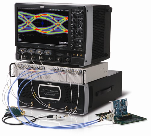 在RX測試時,示波器通過GPIB接口控制RF Switch切換到另一鏈路,如圖8下部分所示,PeRT3的碼型發(fā)生器輸出的加入抖動的信號先通過Compliance Test Channel(由Intel的11英寸背板和3米USB3.0電纜組成),然后連接到USB3夾具,進(jìn)入PUT的RX端,PUT的TX端通過夾具,把信號發(fā)送給PeRT3的Error Dector端。