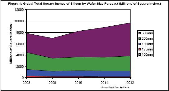 圖1所示為iSuppli公司對2008-2013年硅片面積總產(chǎn)量的預測,按晶圓尺寸細分。