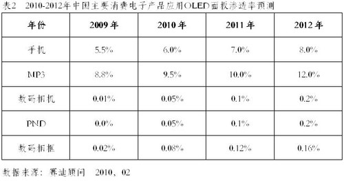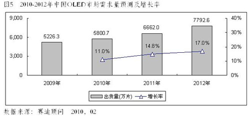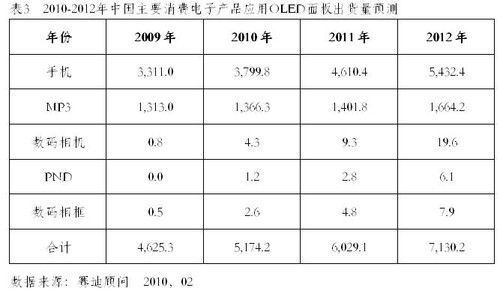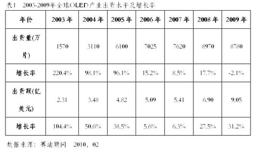 2010年4月13日,中國(guó)權(quán)威ICT研究與管理咨詢(xún)機(jī)構(gòu)賽迪顧問(wèn)股份有限公司在“2010中國(guó)消費(fèi)電子市場(chǎng)年會(huì)”上發(fā)布《2009-2010年中國(guó)OLED產(chǎn)業(yè)發(fā)展研究年度報(bào)告》顯示:隨著手機(jī)和MP3/MP4等應(yīng)用產(chǎn)品需求的推動(dòng),OLED顯示屏市場(chǎng)自2003年開(kāi)始快速成長(zhǎng),到2009年,全球OLED出貨量達(dá)到8780萬(wàn)片,由于受到全球終端產(chǎn)品有所減緩的影響,特別是手機(jī)和MP3市場(chǎng)出貨量的下滑,加上PMOLED全球產(chǎn)量明顯降低,但AMOLED在得到面板廠商大力推動(dòng)下,特別是像諾基亞、三星、索愛(ài)等終端廠商,均在2009年推出一系列采用AMOLED屏幕的手機(jī),在應(yīng)用市場(chǎng)的推動(dòng)下,AMOLED有了較大的增長(zhǎng),不過(guò)OLED總體仍有所下滑。伴隨著AMOLED出貨量的增長(zhǎng)和市場(chǎng)比例的提升,OLED整體產(chǎn)值有明顯的增長(zhǎng),2009年產(chǎn)值達(dá)到9.05億美元,較2008年成長(zhǎng)31.2%,出貨量在下滑的同時(shí),而出貨額保持增長(zhǎng),AMOLED貢獻(xiàn)極為明顯。