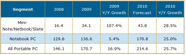 隨著平板電腦市場加溫,DisplaySearch以為2010年上網(wǎng)本及平板電腦將是最快速成長的應(yīng)用別。同時由于開發(fā)中國家需求增加與下半年商用市場復(fù)蘇,傳統(tǒng)翻蓋式筆記本電腦也將持續(xù)增長。對于2010年全球筆記本電腦市場總量估計可達2億1千5百萬臺,年增長率為25.7%。