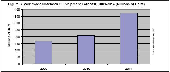據(jù)iSuppli公司,由于經(jīng)濟(jì)形勢好轉(zhuǎn),以及兩大強勢產(chǎn)品領(lǐng)域預(yù)計擴(kuò)張,2010年筆記本電腦將實現(xiàn)兩位數(shù)的增長,突顯整體移動電腦市場繼續(xù)保持強勁勢頭。
