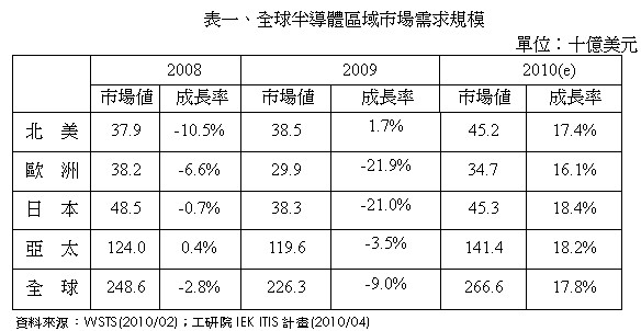 2009年全球半導(dǎo)體市場僅北美地區(qū)微幅成長1.7%,其他皆呈現(xiàn)負(fù)成長:亞太市場衰退3.5%,歐洲市場衰退21.9%,日本市場衰退21.0%。不景氣使得下游電子產(chǎn)品品牌大廠,如Dell、HP、Sony等廠商增加產(chǎn)品委外代工之比例,以降低生產(chǎn)成本,增加其產(chǎn)品競爭力。因此,2009年主要從事代工生產(chǎn)之亞太地區(qū),才會出現(xiàn)僅小幅衰退之情形。至于北美地區(qū)則是因為受到下游品牌廠商降價促銷成功,使得市場呈現(xiàn)小幅成長。