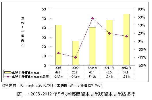 金融風(fēng)暴使得全球廠商皆大幅減少資本支出金額,以保存手中之現(xiàn)金,度過此波不景氣。 2009年全球半導(dǎo)體資本支出為259億美元,較2008年429億衰退39.6%。然而,在看好今年歐美主要消費(fèi)市場需求之復(fù)蘇,以及新興市場需求力道可望持續(xù)下,2010年全球半導(dǎo)體廠商將提高資本支出達(dá)407億美元規(guī)模,較2009年大幅成長57.1%。其中,全球記憶體廠商大幅提高資本支出,以提升其先進(jìn)制程水準(zhǔn),是主要動力之一。