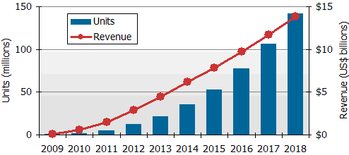 - 預(yù)估到2018年將大幅成長到1億4千200萬臺(tái),年產(chǎn)值達(dá)139億美元