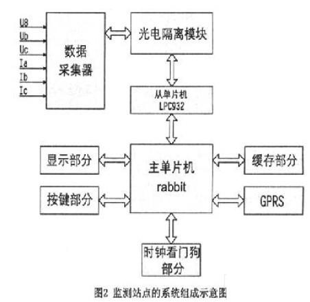 監(jiān)測站點(diǎn)由前端數(shù)據(jù)采集器和現(xiàn)場下位機(jī)構(gòu)成,其中前端數(shù)據(jù)采集器采用CS5460模塊和LPC932單片機(jī)構(gòu)成,它負(fù)責(zé)采集監(jiān)控現(xiàn)場的各項(xiàng)數(shù)據(jù)并存儲(chǔ)。線路的內(nèi)部經(jīng)過嚴(yán)格的電磁隔離,測量電路經(jīng)過采樣、A/D轉(zhuǎn)換處理后形成的數(shù)字信號(hào)再經(jīng)過光電耦合由信號(hào)適配器向從單片機(jī)LPC932傳送,主單片機(jī)與從單片機(jī)之間可采用I/O口模擬時(shí)序的方式進(jìn)行串口通信。