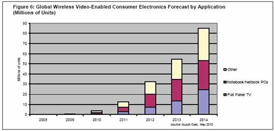 iSuppli公司預(yù)測(cè),2014年具有高帶寬無線視頻接口的支持視頻的CE設(shè)備市場(chǎng)將增長(zhǎng)到8520萬個(gè)以上,而2009年是60.6萬個(gè),該期間的復(fù)合年度增長(zhǎng)率為169.0%。到2014年,逾5300萬個(gè)此類設(shè)備將是支持無線視頻的數(shù)字電視和面向消費(fèi)類上網(wǎng)本/筆記本。
