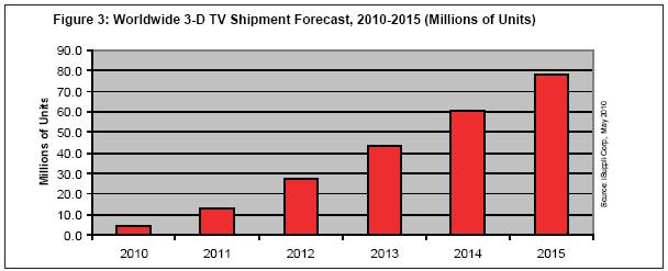 3D電視3月首次上市,由于日益受到歡迎以及早期接受者的接納,預(yù)計2010年全球出貨量將達到420萬臺。2011年全球3D電視出貨量將是今年的三倍,達到1290萬臺,2012年再增長一倍達到2740萬臺。