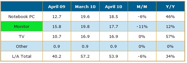 根據(jù)DisplaySearch最新關(guān)于4月份大尺寸TFT LCD出貨量報(bào)告指出,4月份大尺寸面板出貨量達(dá)5千3百90萬(wàn)片,較3月份下滑6%;出貨金額為71億美元,與上月相比下滑4%。不過(guò)相比較2009年4月份出貨情況,今年4月出貨量較去年增加34%,出貨金額增加達(dá)72%之多。
