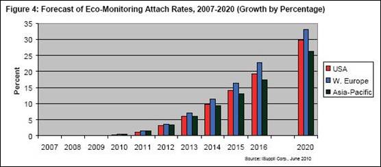 上述每類應(yīng)用的汽車配售率預(yù)計(jì)都會(huì)增長(zhǎng),2010-2013年增長(zhǎng)比較緩慢,隨后從2014年開(kāi)始基本以兩位數(shù)的速度增長(zhǎng),直到2020年末。iSuppli公司的圖表顯示,節(jié)能監(jiān)測(cè)和節(jié)能建議近期將大幅增長(zhǎng),而由于復(fù)雜性和需要與其它汽車系統(tǒng)整合,節(jié)能動(dòng)力總成的布署比較緩慢。但到2020年,美國(guó)和西歐的節(jié)能動(dòng)力總成應(yīng)用將達(dá)到35%的配售率,接近節(jié)能監(jiān)測(cè)和節(jié)能建議系統(tǒng)的水平。