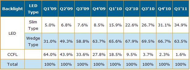 裝載薄型導(dǎo)光板之薄型LED Backlight在筆記本電腦面板市場(chǎng)正快速成長(zhǎng)。根據(jù)DisplaySearch最新的Quarterly LED Backlight Panel Shipment and Forecast Report (每季LED Backlight面板出貨與預(yù)測(cè)報(bào)告)中指出,筆記本電腦使用的面板當(dāng)中,薄型LED Backlight的比重將由2010年第四季的16%成長(zhǎng)到2010年的31%。報(bào)告并指出,LED Backlight在筆記本電腦面板的滲透率由2009年第一季的36%擴(kuò)大到2010年第一季的81.5%,展望到今年年底預(yù)計(jì)滲透率將高達(dá)97.7%;換言之傳統(tǒng)的CCFL Backlight在Notebook PC市場(chǎng)將接近完全退出的狀態(tài)。