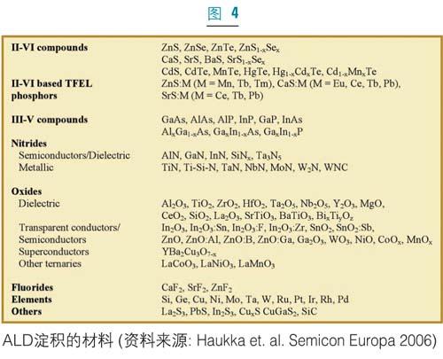 因?yàn)锳LD在半導(dǎo)體制造的不同領(lǐng)域都經(jīng)過(guò)評(píng)估和采用,所以選擇合適的原始反應(yīng)物(precursor)就變得日益重要。ALD原始反應(yīng)物應(yīng)當(dāng)具備幾個(gè)“理想”的品質(zhì),即要具有一定的揮發(fā)性和可重復(fù)的汽化率;理想情況下不應(yīng)在反應(yīng)溫度下發(fā)生自身反應(yīng)或分解;應(yīng)當(dāng)極易與補(bǔ)充反應(yīng)物發(fā)生反應(yīng);應(yīng)能產(chǎn)生可揮發(fā)的副產(chǎn)品;基于生長(zhǎng)速率和成核的原因應(yīng)具有最佳的配合基尺寸。為了使用方便,原始反應(yīng)物最好為液體有機(jī)金屬物,但是薄膜的性質(zhì)和應(yīng)用指標(biāo)(如雜質(zhì)含量、電學(xué)特性等)應(yīng)該決定材料的選擇。另外,對(duì)制備成本的關(guān)注也要求反應(yīng)源能與傳統(tǒng)的制備工藝在成本上更有競(jìng)爭(zhēng)性。ALD具有很高的反應(yīng)源的使用效率,這通常能平衡新反應(yīng)源的高價(jià)格。隨著ALD進(jìn)入大規(guī)模生產(chǎn),并且工業(yè)界減少對(duì)反應(yīng)源的選擇,對(duì)成本的顧慮將可能會(huì)隨著化學(xué)品供應(yīng)商規(guī)?;渖L(zhǎng)流程而減輕。利用現(xiàn)有的反應(yīng)源,目前人們已經(jīng)可以制備多種多樣的ALD薄膜(圖4)。