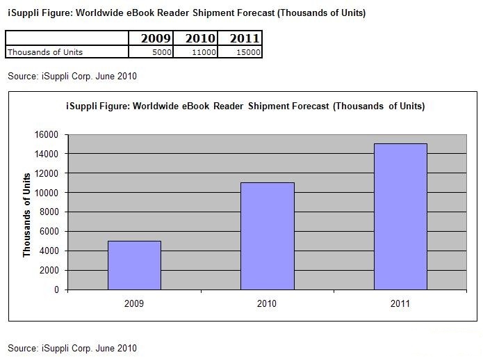 短期內(nèi),當(dāng)電子書閱讀器的價(jià)格壓低到iPad起始價(jià)格點(diǎn)的一半左右時(shí),可能會(huì)吸引消費(fèi)者購買電子書閱讀器。不過,長期來看,電子書閱讀器仍可能有著比最初預(yù)期的更多利基。iSuppli預(yù)測,全球電子書閱讀器出貨量在2010年將達(dá)1,100萬部,2011年還可望成長120%,達(dá)到1,500萬部。