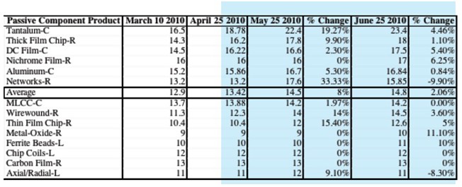 根據(jù)Paumanok Publications, Inc公司調(diào)查顯示,上月被動(dòng)元件交貨期平均每45天就延長4%(被動(dòng)元件交貨期繼續(xù)延長 供應(yīng)鏈持續(xù)緊張),最近一次調(diào)查則顯示,截止6月25日被動(dòng)元件交貨期和上月相比再次提升2%,平均交貨期為14.8周。下圖為3月至6月25日的被動(dòng)元件交貨期情況。