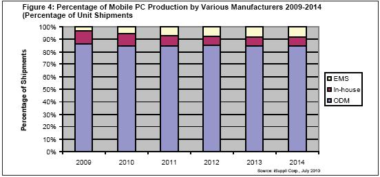 圖4所示為iSuppli公司對移動PC產(chǎn)量份額的預(yù)測,按制造商類型細(xì)分。