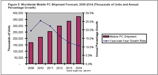 2009年全球移動PC出貨量增長19.6%至1.669億臺,到2014年將增長一倍以上,達(dá)到3.715億臺。