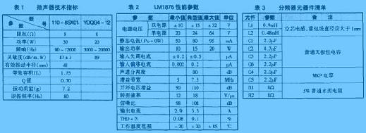 圖9是該音箱分頻器電路圖,分頻點選在3kHz。由于揚聲器是一個感性負載,當通過信號頻率不同時,其阻抗變化很大,故在分頻器中加入了由R1、C3、R2、C6組成的阻抗校正網(wǎng)絡,使分頻器的負載阻抗近似為恒定值。分頻器所用元器件的參數(shù)如表3所示。
