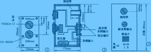 功放電路安裝在右聲道音箱中,因此左右兩個音箱的后面板布局有較大的差異。倒相管長度以及主音箱側面視圖如圖2所示。主音箱背面視圖如圖3所示。