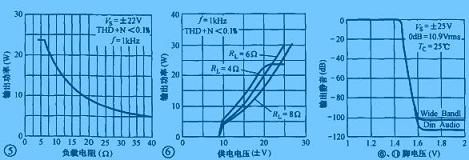 LM1876的負載范圍很寬,在4~30Ω的范圍內(nèi)均能穩(wěn)定地工作,其輸出功率與負載的對應關系如圖5所示。LM1876的供電電壓范圍為±10~±25V,當供電電壓降低時,影響的只是輸出功率的大小,而對其他指標影響不大,供電電壓與輸出功率的對應關系如圖6所示。LM1876的6、11腳為左/右聲道靜噪控制端,當這幾腳接高電平(高于1.6V)時,LM1876內(nèi)部電路執(zhí)行靜音操作,切斷輸出端的音頻信號(如圖7所示)。因此可以在這些引腳中與正電壓之間接一個RC延時網(wǎng)絡,使其在開機瞬間為高電平,輸出電路無音頻信號輸出,延時一段時間后,再正常輸出,以達到避免開機瞬間輸出端電位失諧對揚聲器的沖擊。在圖4中,晶體管VT1、R24、C16、R20、C15即為開機延時網(wǎng)絡,調(diào)整它們的取值范圍,可以改變延時時間的長短,從而獲得滿意的開機延時時間。