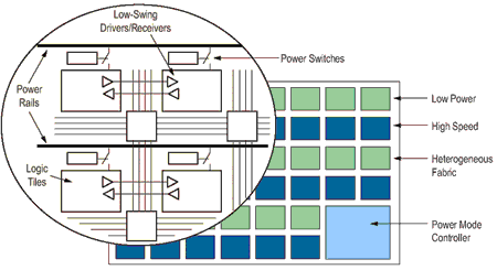 圖3所示為具有上述某些概念的FPGA架構(gòu),其可編程異構(gòu)架構(gòu)由高速度和低功耗兩個(gè)區(qū)組成。一個(gè)片上功耗模式控制器可管理各種降功耗模式,即深睡眠模式、懸掛模式和休眠模式。在架構(gòu)內(nèi)部,可以用專(zhuān)用的供電開(kāi)關(guān)關(guān)掉每個(gè)邏輯塊的電源。通過(guò)布線架構(gòu)的通信信號(hào)流經(jīng)低擺幅驅(qū)動(dòng)器和接收器,以降低互連功耗。