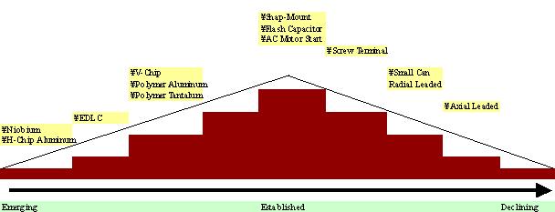 鋁電容器技術(shù)路線圖已經(jīng)發(fā)展到一個節(jié)點(diǎn)上,在此新投資聚集在鋁固體聚合物元件,以及作為替代技術(shù)的碳和鈮介質(zhì)開發(fā)上。更完善的產(chǎn)品,如單元安裝電容器(snap-mount)、閃光電容器(flash capacitor),和馬達(dá)啟動鋁電容器(motor start aluminum capacitors)已收到有限的投資,但繼續(xù)服務(wù)于更小的、增值的電容細(xì)分市場。老產(chǎn)品用于新技術(shù)研發(fā)所獲得的資金支持會更少,包括標(biāo)準(zhǔn)的徑向引線鋁電容器和軸向鋁電容器。例如,軸向引線鋁電容器,近些年來已經(jīng)很少受到關(guān)注,但是他們現(xiàn)在作為一個傳統(tǒng)產(chǎn)品,在國防和汽車應(yīng)用方面仍然保有市場。當(dāng)用于上述圖表中列舉的所有主要產(chǎn)品的投資,在過去20年中獲得了不同程度的回報之時,市場已經(jīng)轉(zhuǎn)向鋁固體聚合物電容設(shè)計,行業(yè)中的主要供應(yīng)商正在調(diào)整自己的定位以把握巨大的市場機(jī)會。而且,在一些不同用途的關(guān)鍵細(xì)分市場上,如醫(yī)療電子,石油和天然氣勘探等領(lǐng)域,引入導(dǎo)電聚合物鋁技術(shù),也會帶來增值和在特定應(yīng)用市場的機(jī)會。