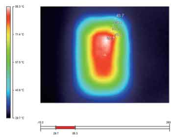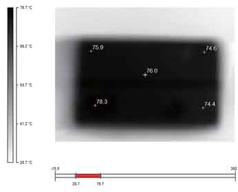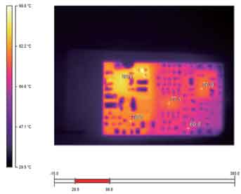 圖6~9是利用Ti20拍攝的金升陽公司12W產(chǎn)品的熱圖像。通過這些圖片,我們不僅可以清晰地看出整體的熱分布(相同的溫度,所用的顏色是一致的),還可以借助其提供的軟件分析每一個(gè)元器件此時(shí)對(duì)應(yīng)的溫度值,如幾個(gè)溫度相對(duì)較高的元器件的溫度值分別如表1所示。
