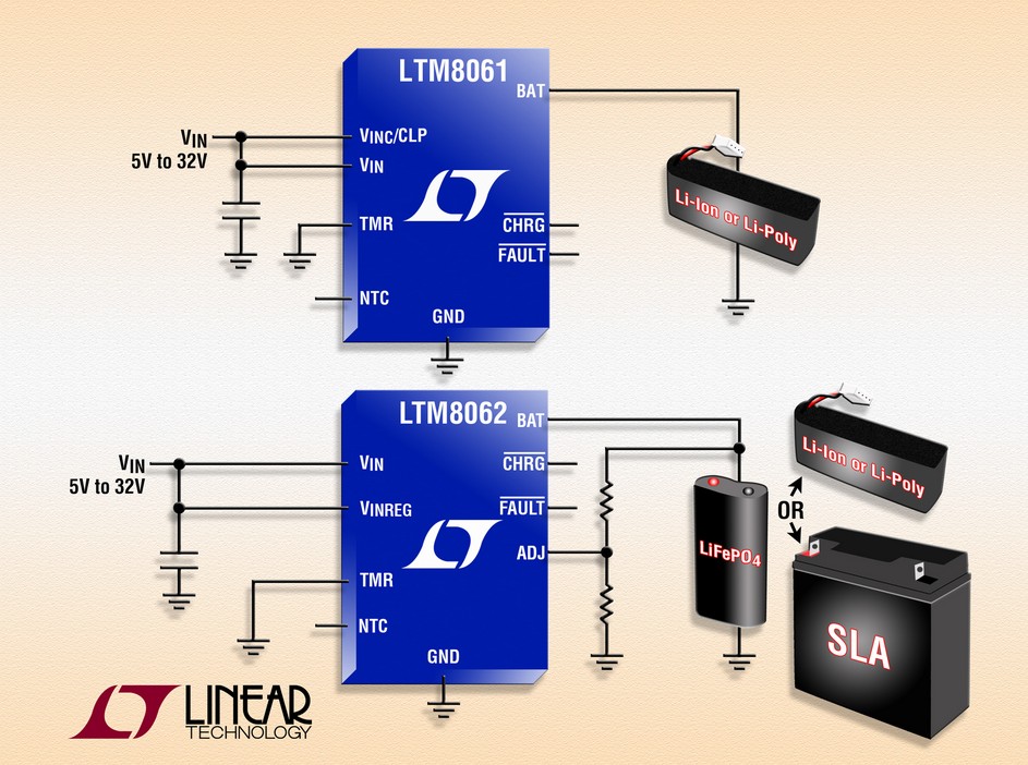 LTM8061特別適用于給鋰離子電池或鋰聚合物電池充電,并具有 4.1V、4.2V、8.2V 和 8.4V的浮動電壓。一個可在外部調(diào)節(jié)的浮動電壓使 LTM8062 能支持單節(jié)和多節(jié)鋰離子電池、鋰聚合物電池、磷酸鐵鋰電池 (LiFePO4) 和密封鉛酸 (SLA) 電池充電至 14.4V。
