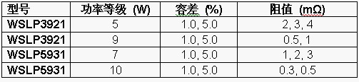 WSLP3921電阻的尺寸為0.394英寸 x 0.205英寸(10.0mm x 5.2mm),最大高度為0.020英寸(0.5mm),WSLP5931的尺寸為0.591英寸 x 0.305英寸(15.0mm x 7.75mm),高度為0.020英寸(0.5mm)。專利的加工工藝使電阻具有0.0003Ω~0.004Ω的極低阻值,以及1.0%和5.0%的嚴(yán)格容差。