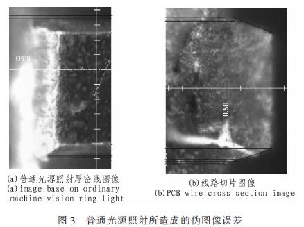 從圖中可以清晰地看到,目前的普通光源攝取的圖像和真實(shí)的截面圖有明顯的邊緣偏差,在2X的倍率下,1像素對(duì)應(yīng)的物面尺寸為1.61μm。偽圖像邊緣造成的線寬差別超過(guò)3像素。使得系統(tǒng)準(zhǔn)確度大為降低。該偽圖像邊緣產(chǎn)生的原因是由于普通光源光線照射角度過(guò)小。被厚密線路遮擋大部分光線后,基材和下線寬的亮度和顏色非常接近。而一般的線寬測(cè)試中,并沒有將該偏差計(jì)入測(cè)量結(jié)果。致使測(cè)量值產(chǎn)生一個(gè)固有方向的系統(tǒng)誤差,也就是說(shuō),如果該誤差不能被消除,所測(cè)得的數(shù)據(jù)不是真實(shí)PCB的線路特征的反映。而該誤差并不能通過(guò)改變圖像的清晰程度和對(duì)比度消除,只能依據(jù)PCB厚密線路的特點(diǎn)去改變光源的設(shè)計(jì)來(lái)消除或減小該誤差。