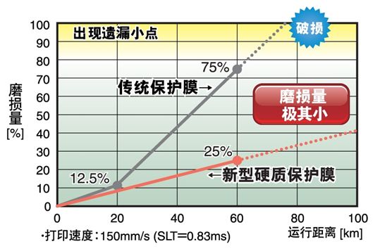 為了應(yīng)對這種情況,采取了將打印頭的保護膜材料變更為硬質(zhì)材料等對策,但提高保護膜的強度的課題是保護膜的組成和發(fā)熱部分的形狀設(shè)計。在以往的產(chǎn)品中,使用某些劣質(zhì)熱敏紙時,使用壽命僅10km左右,這當(dāng)然與打印機的使用頻率也有關(guān)系,但發(fā)生過幾個月左右就無法使用的案例。羅姆面對這種情況,一直致力于改善保護膜材料中的硬質(zhì)材料的結(jié)構(gòu)和打印頭結(jié)構(gòu)。這次開發(fā)的熱敏打印頭通過優(yōu)化保護膜材料的構(gòu)成物質(zhì)及其組成,大幅提高了耐磨性,實現(xiàn)了比以往產(chǎn)品高約3倍的耐久性(保證150km(以往產(chǎn)品是50km))。另外,通過提高保護膜的熱導(dǎo)率,打印效率也比以往改善了15%,同時還提高了打印質(zhì)量。而且,這種打印頭的形狀保持與以往產(chǎn)品完全相同,因此無需進行打印機的設(shè)計變更,另外,這種規(guī)格還可以用于修補替換。