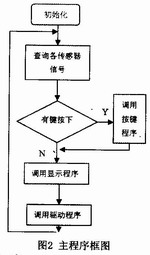 主程序的主要功能是循環(huán)調(diào)用顯示子程序、按鍵子程序,查詢各輸入信號狀態(tài),根據(jù)按鍵設(shè)定的各種參數(shù)和各輸入信號狀態(tài)控制各執(zhí)行機構(gòu),完成對PCB周轉(zhuǎn)箱托架系統(tǒng)的傳動控制,以及對PCB板的有序傳送,判別系統(tǒng)運行狀態(tài)是否異常,并及時報警或解除報警。主程序框圖如圖2所示。