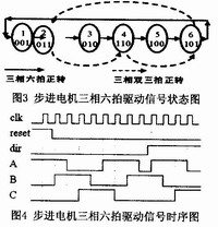 驅(qū)動子程序主要負責(zé)生成步進電機驅(qū)動器所需要的信號。當(dāng)上行鍵或下行鍵按下,或者根據(jù)主程序運行結(jié)果,需要提升或降落周轉(zhuǎn)箱托架,主程序會調(diào)用步進電機驅(qū)動子程序。步進電機采用三相六拍工作方式,根據(jù)絲杠付螺紋間距,計算出步進電機每步進程,再根據(jù)周轉(zhuǎn)箱板間距,確定不同工況下,步進電機的正/反轉(zhuǎn)步數(shù),這些步數(shù)保存在各相應(yīng)存貯器里,供主程序調(diào)用驅(qū)動子程序時使用。圖3和圖4分別為步進電機三相六拍工作方式時驅(qū)動信號的狀態(tài)圖和時序圖。