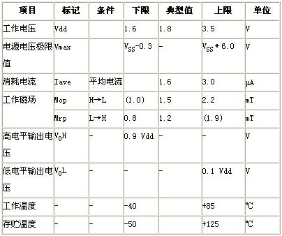 圖2為AS系列的外觀形狀。除了業(yè)界標準的SOT23(2.9×2.8×1.2mm),SON4(2.0×2.1×0.6mm)之外,加上超小型的XSON(1.2×1.2×0.4mm),共3種規(guī)格,可根據(jù)實際空間組合選擇。表1是AS系列的代表產品AS-M15TA-R的規(guī)格一覽表,其中最重要的是工作磁場。工作磁場是指輸出信號改變的磁場,為了防止跳躍現(xiàn)象(“高”和“低”在閾值附近反復出現(xiàn)的現(xiàn)象),具有磁滯區(qū)間,如圖3所示。除了標準特性外,還具有靈敏度可變,工作電壓的擴大可變等特性。詳細的規(guī)格標準就不在此詳述。圖4是為了減少消耗電流進行的抽樣測定的說明簡圖。