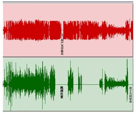 在同步過(guò)程中,S在170m左右時(shí),在無(wú)屏蔽隔阻的情況下出現(xiàn)跑頻現(xiàn)象,再前進(jìn)約5m就完全沒(méi)有信號(hào),參見(jiàn)圖2(下):L有212m左右時(shí)進(jìn)入北門洞,由于屏蔽很嚴(yán)重而出現(xiàn)跑頻現(xiàn)象,參見(jiàn)圖2(上)。圖2的時(shí)間座標(biāo)相同,波形中中斷部分為因跑頻而贊成的無(wú)接收信號(hào),可以看出。L的接收情況遠(yuǎn)好于S。